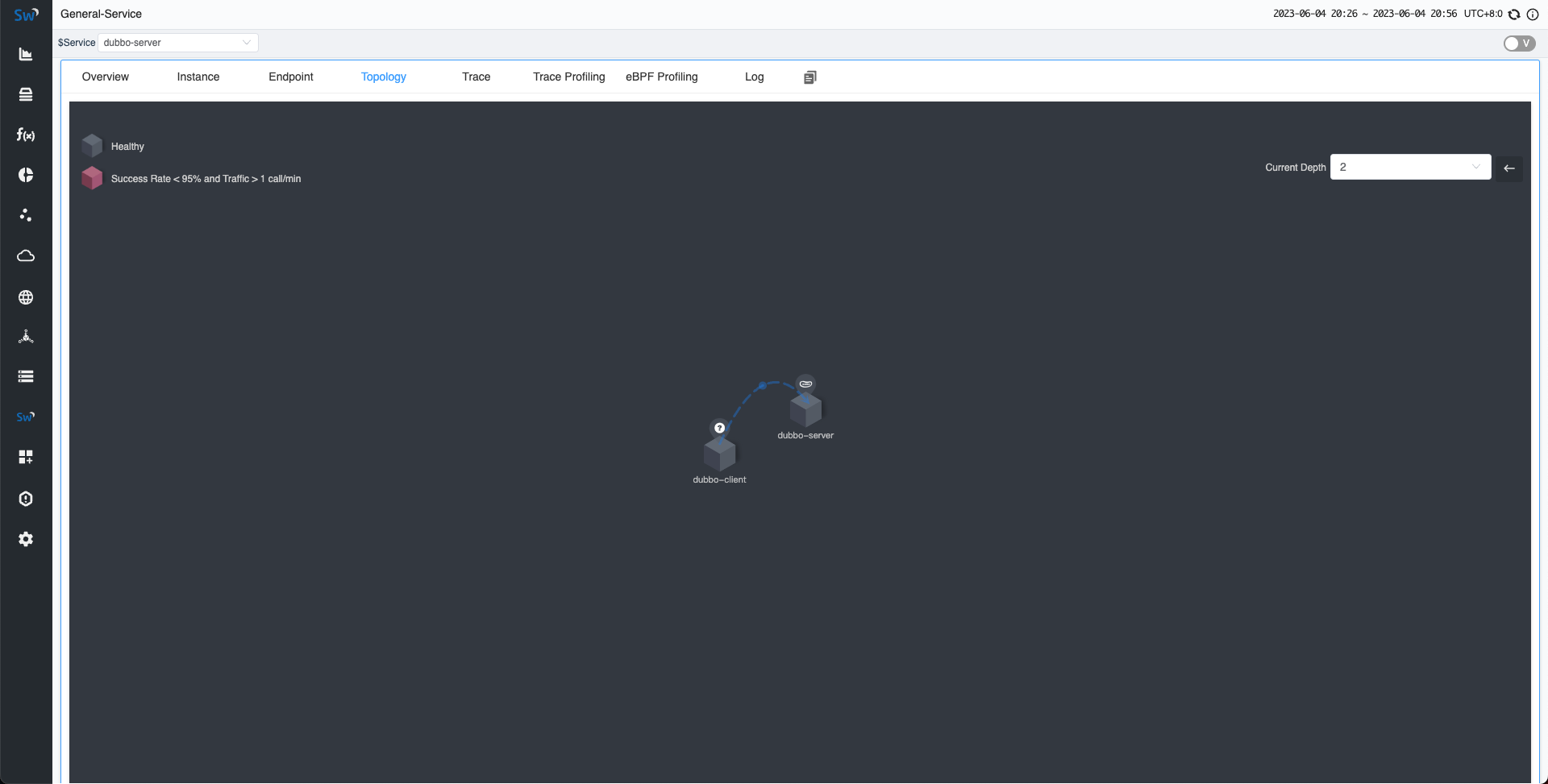 现在,由于客户端会自动像服务器端发送请求,现在就可以在 SkyWalking UI 中观察结果。